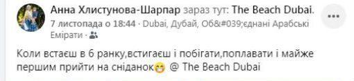 Відома спортсменка Анна Хлистунова-Шарпар, яка проходить до Рівненської міської ради Рівного за списками партії «За майбутнє» поділилася світлинами зі свого відпочинку у Фейсбуці. Майбутня депутатка відпочиває у Дубаї ОАЄ.