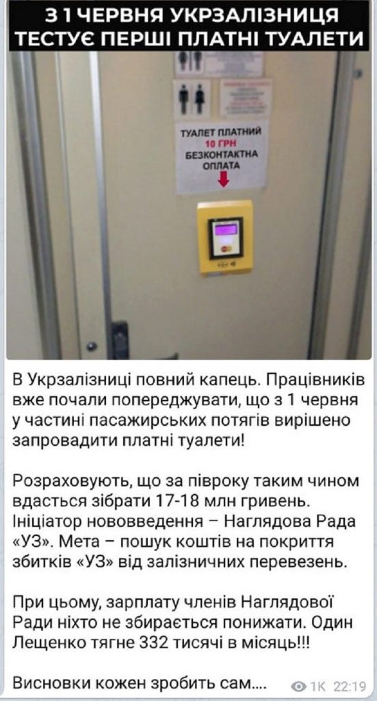 З’явилися чутки, що “Укрзалізниця” для покриття збитків готує нові розцінки на свої послуги. Повідомлялося, що вартість одного відвідування вбиральні у вагонах пасажирських потягів сягатиме 10 гривень, оплату можна провести безконтактним способом. За словами керівника з комунікацій і маркетингу пасажирського напрямку УЗ Олександра Шевченко, інформація про платні туалетах є фейком і абсолютно не відповідає дійсності.