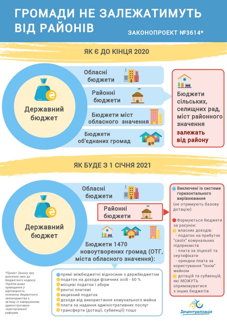 Як відомо, законопроект передбачає, що сільські, селищні, міські бюджети з наступного року не залежатимуть від району. Всі 1469 територіальних громад, території яких уже затвердив Уряд, з 1 січня 2021 року перейдуть на прямі міжбюджетні відносини з державним бюджетом.
