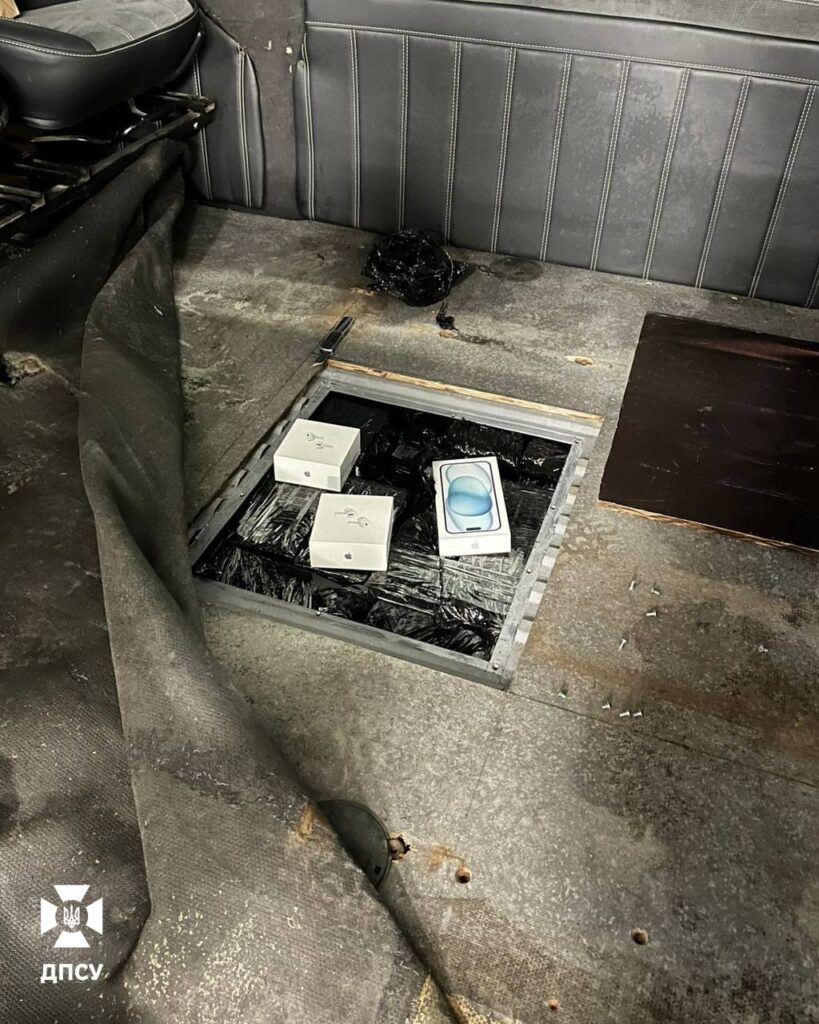 Під час огляду автомобіля прикордонники разом із митниками демонтували конструктивні елементи кузова. У спеціально облаштованому сховку в днищі мікроавтобуса виявили мобільні телефони iPhone різних моделей, смартгодинники та навушники Apple.