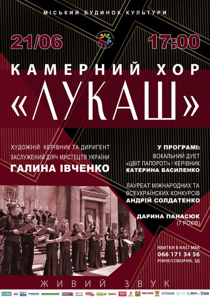 21 червня, у другий день Трійці, камерний хор “Лукаш” Міського Будинку Культури дарує рівнянам свій грандіозний сольний концерт.