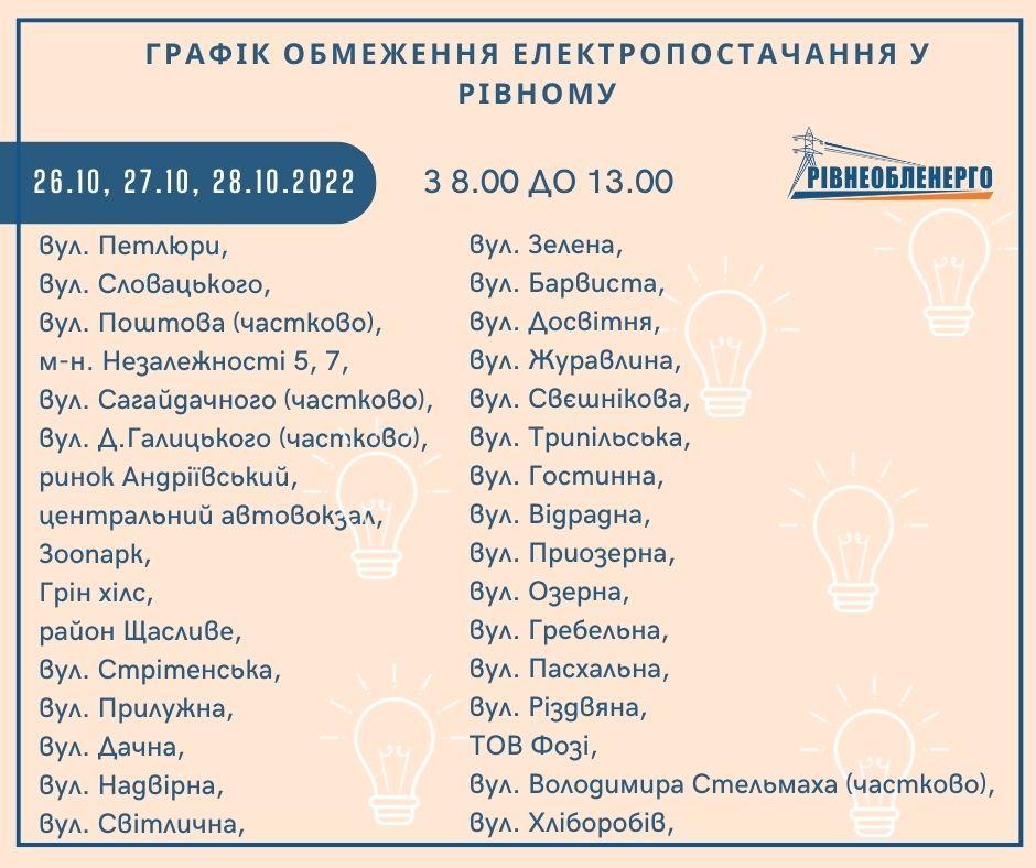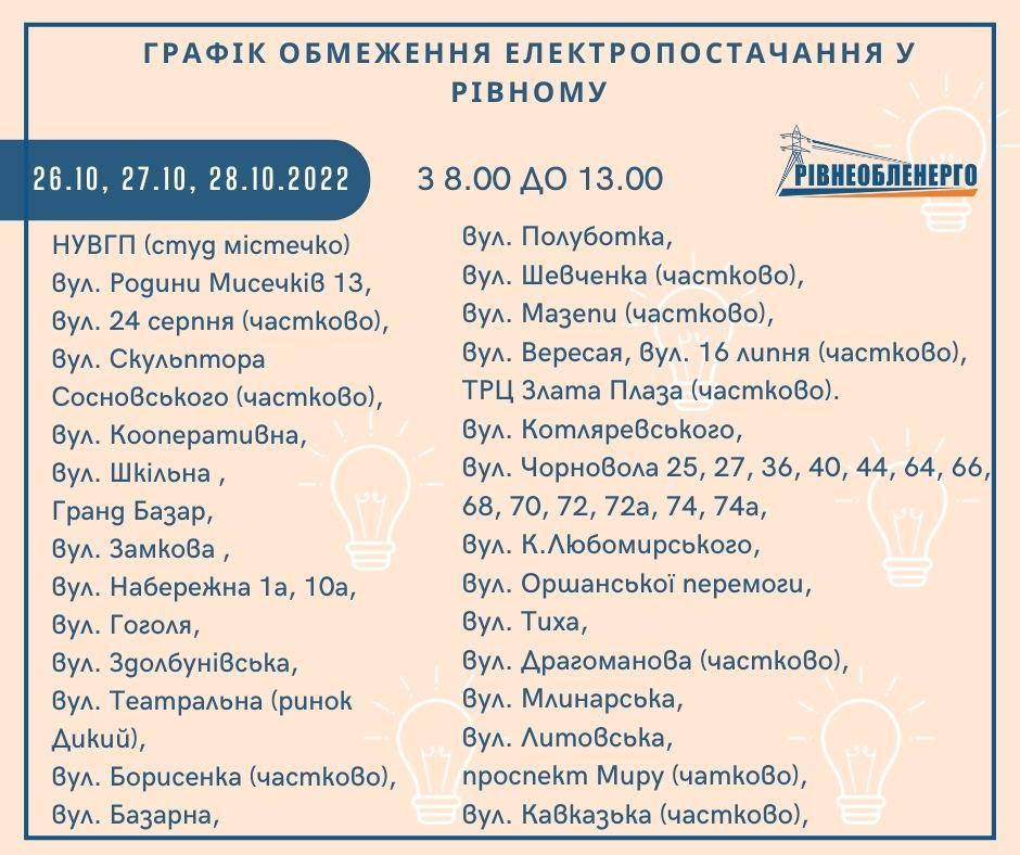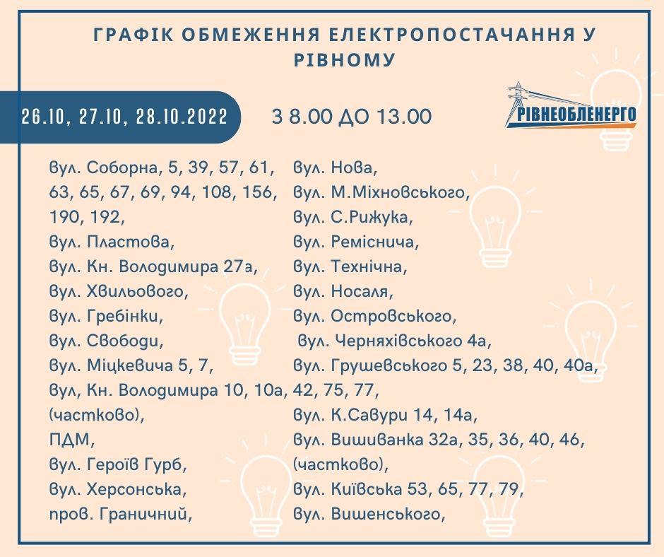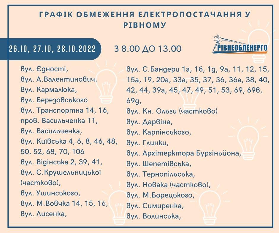 Планові відключення світла у Рівному з 26 по 28 жовтня триватимуть, повідомили в Рівнеобленерго.