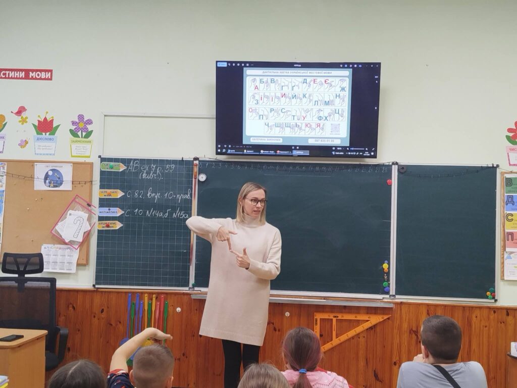 Заняття провела перекладачка української жестової мови, керівниця студії розвитку для дітей з порушенням слуху Катерина Зарічнюк. Школярі повторили алфавіт, вчилися показувати свої імена, опановували ввічливі слова та найуживаніші фрази, а також спілкувалися між собою жестами.