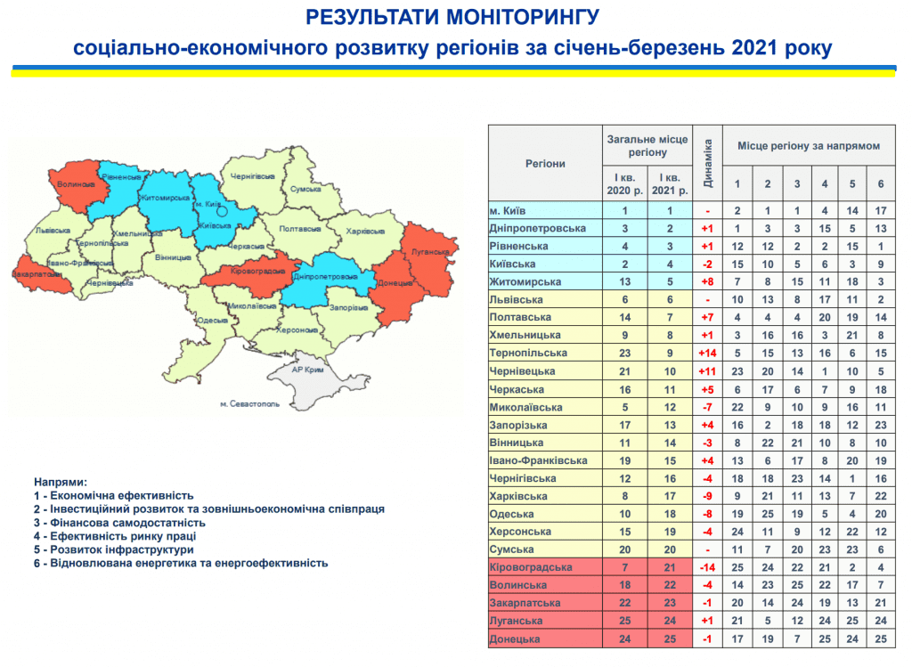 Як повідомив голова Рівненської ОДА Віталій Коваль, у першому кварталі цього року Рівненщина перша за напрямом «Енергоефективність» (+5 пунктів за рік), друга за показниками: «Фінансова самодостатність» (+6 пунктів) та «Ефективність ринку праці» (+10).