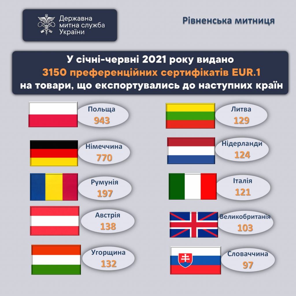 У січні – червні 2021 року до країн ЄС та ЄАВТ, Ізраїлю та Великої Британії Рівненською (Поліською) митницею видано 3150 преференційних сертифікатів з перевезення товару EUR.1 на товари українського походження.