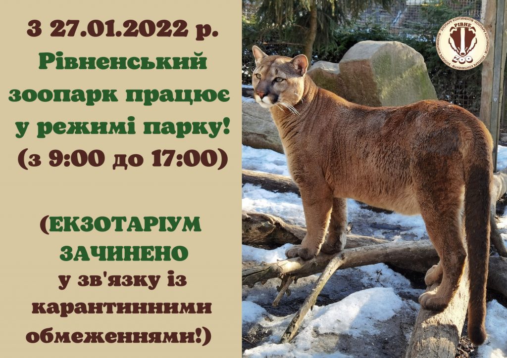 З 27 січня Рівненський зоопарк працює з 9:00 до 17:00. А ось екзотераріум взагалі зачинено у зв’язку з карантинними обмеженнями.