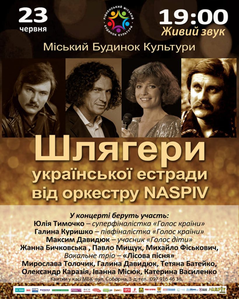 Квитки в касі МБК та онлайн за посиланням:https://kasa.in.ua/ua/rivne/concert/shliahery-ukrainskoi-estrady-2021-06-23