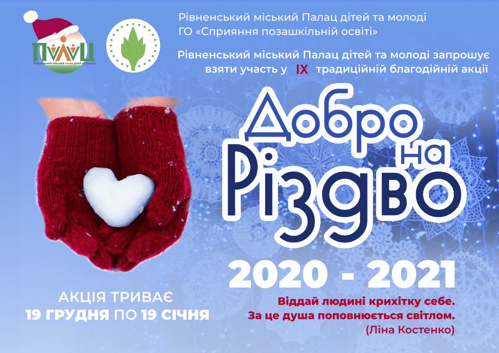 Підтримка та здійснення мрій дітей з особливими потребами, соціально незахищених та вразливих категорій, тяжкохворих, що потребують довготривалого лікування – головна місія благодійної акції “Добро на Різдво”. Вже дев’ять років поспіль у Рівненському Палаці дітей та молоді, в період новорічно-різдвяних свят, з 19 грудня до 19 січня, здійснюються мрії дітей, яким особливо потрібна підтримка та віра в диво.