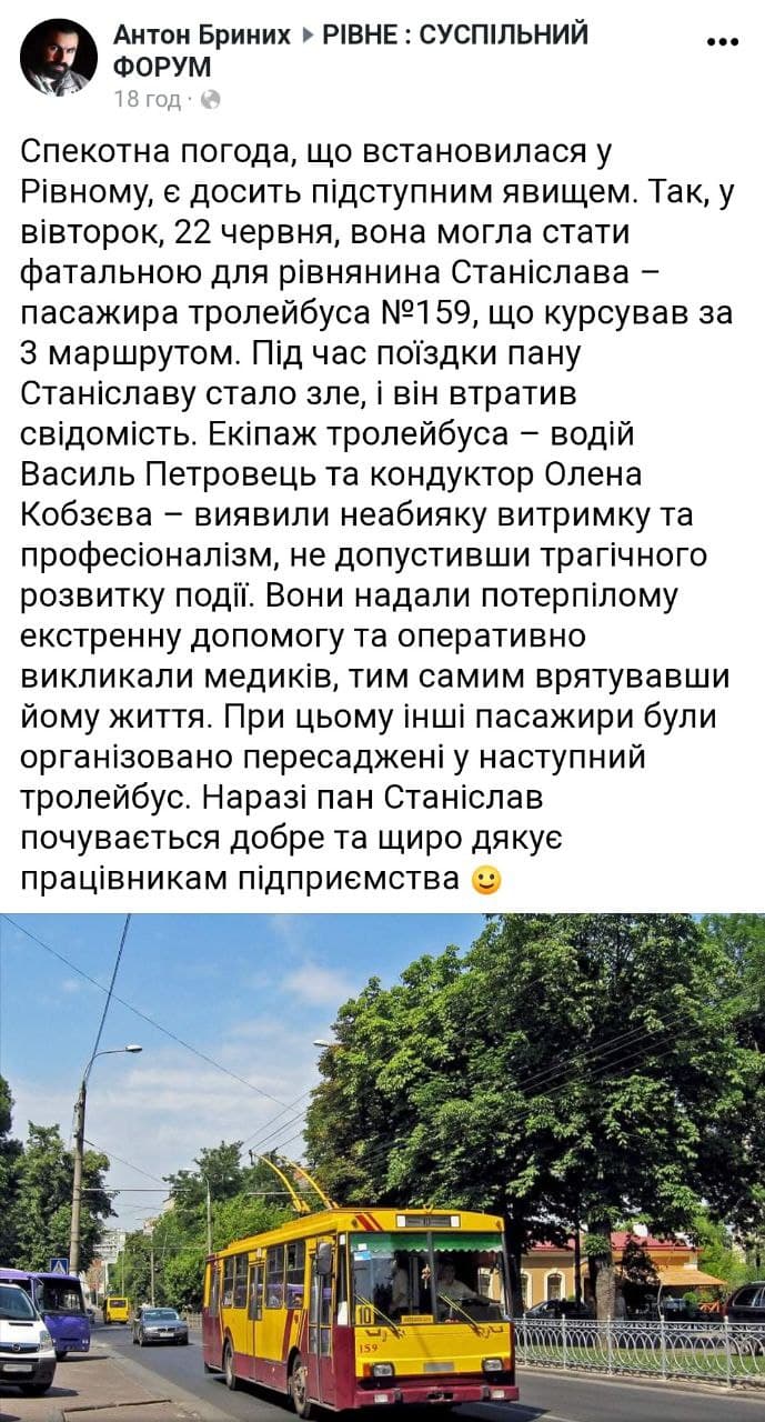 Про цю пригоду розповів Антон Бринних у Фейсбуці. За його словами, пасажиру стало зле під час поїздки у тролейбусі , що курсує за маршрутом 3.