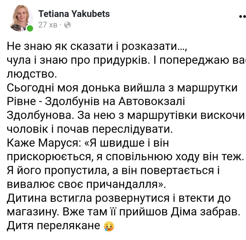 Про цей прикрий інцидент, який трапився сьогодні увечері з її дитиною у Фейсбуці розповіла мама дівчинки Тетяна Якубець.