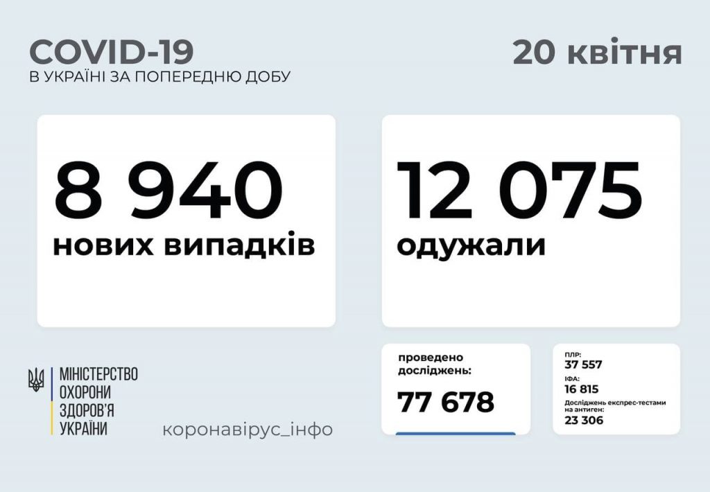 8 940 нових випадків коронавірусної хвороби COVID-19 зафіксовано в Україні станом на 20 квітня 2021 року. Зокрема, захворіли 414 дітей та 251 медпрацівник.