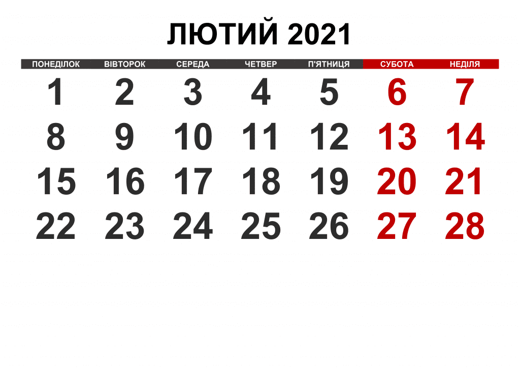 Лютий 2021 року буде традиційно коротким, через те, що в ньому всього 28 днів. За календарем буде рівно 20 робочих днів і 8 вихідних – суботи та неділі. Офіційних державних вихідних в цьому місяці немає.