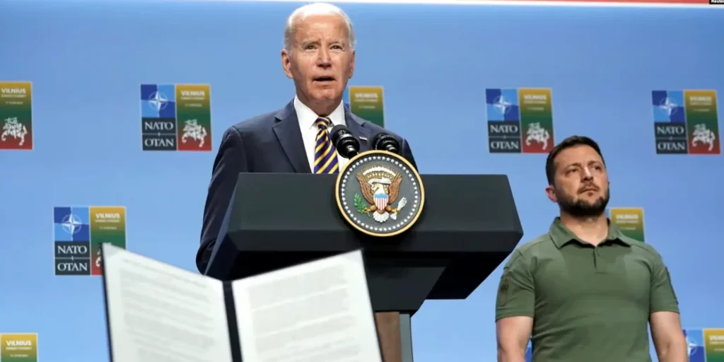 Фото: Президент США Джо Байден оголошує про схвалену Декларацію щодо підтримки України. Вільнюс, Литва, 12 липня 2023 року (Reuters/Kevin Lamarque).