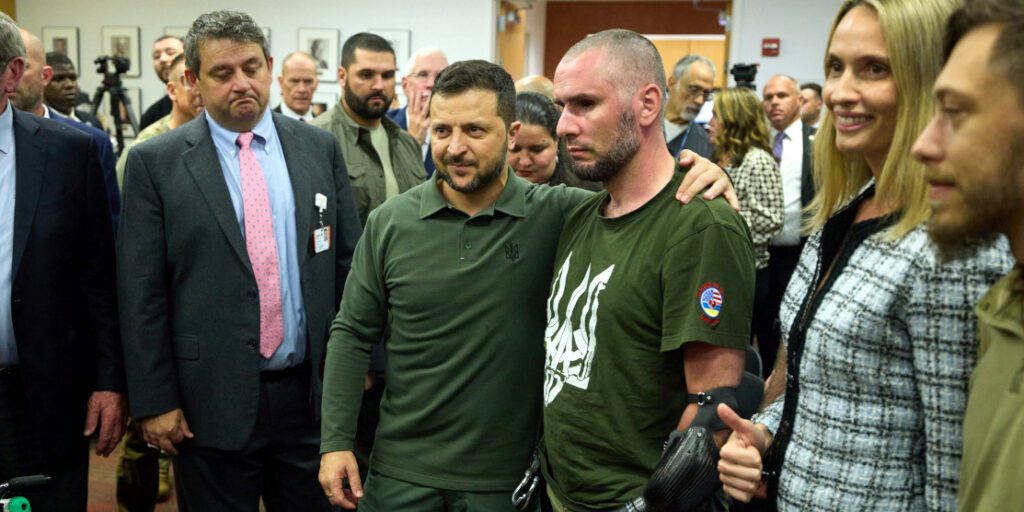 У Нью-Йорку Президент України Володимир Зеленський відвідав клініку Staten Island University Hospital, де проходять лікування та реабілітацію поранені українські військовослужбовці.