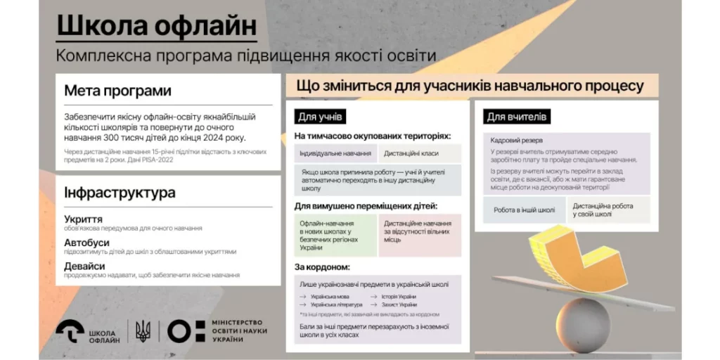 Щоб змінити ситуацію, МОН упроваджує комплексну стратегію Школа офлайн. Вона почне діяти вже з 1 вересня, впровадження буде поступовим. Мета Школи офлайн — повернути 300 тисяч учнів до безпечного очного навчання. А там, де очне навчання неможливе, — підвищити якість дистанційного.