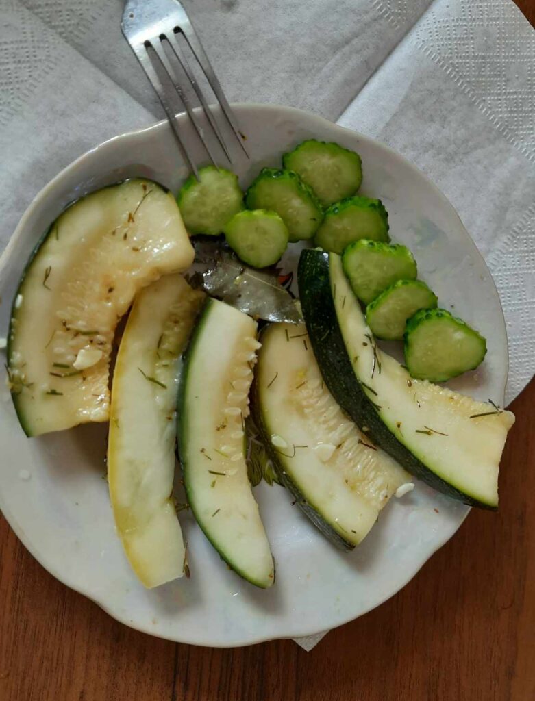 Невеличких молоденьких кабачків візьміть енну кількість. Залежатиме від числа шанувальників цього цілющого овоча в сім’ї. Поріжте їх навпіл та брусками довільного розміру. Закип’ятіть чайник і окропом залийте складені у мисці кабачки. Дайте їм постояти в окропі від 3 до 7 хвилин. Злийте воду.Заправлятимемо на смак та «на око». Такий спосіб, «на око», завжди викликає довгі роздуми і нерозуміння. Але українська мова багата, тож швидко приходить усвідомлення, що і як саме треба робити.Отож, солимо за смаком, поливаємо для гостроти соком лимона, притрушуємо для пікантності чорним (червоним) перцем – більше-менше залежить від того, хто що любить. Адже комусь занадто, іншому – замало. Вкидаємо 5-6 ароматних лаврових листочки, посипаємо дрібно січеним кропом, заправляємо олією. Все гарненько перемішуємо.