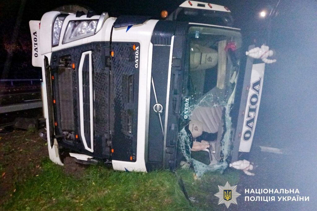 Як повідомили у поліції, 34-річний водій «Volvo», житель села Пугачівка, не вибрав безпечної швидкості, не впорався з керуванням і виїхав на зустрічну смугу. Внаслідок цього транспортний засіб врізався у відбійник і перекинувся.