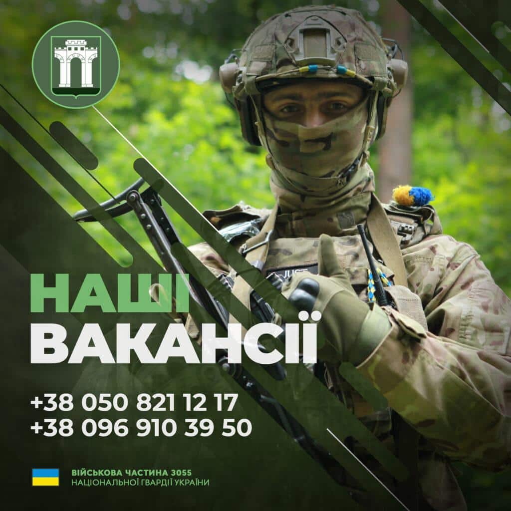 Військова частина 3055 Національної гвардії України оголосила набір на низку посад. Заробітна плата — від 20 до 121 тисячі гривень залежно від посади, надбавок і умов служби.
