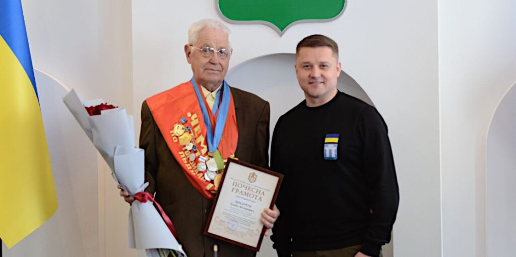 Міський голова Рівного Олександр Третяк відзначив почесною грамотою легенду мотоспорту Леоніда Шмарчука.