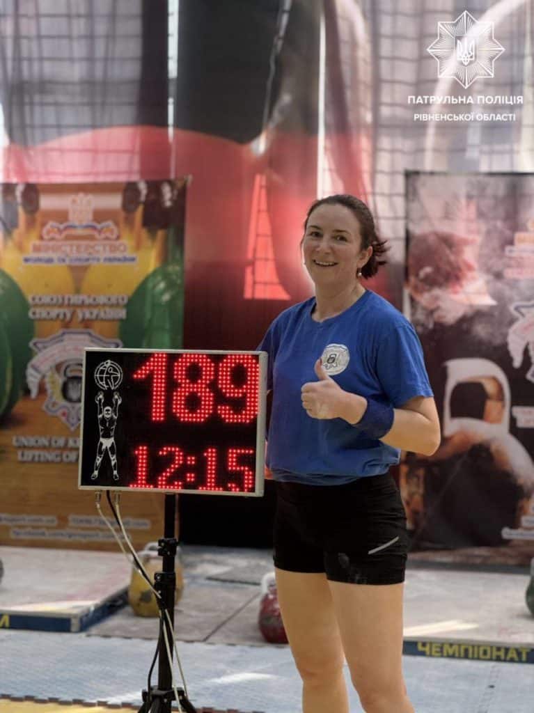 Патрульна з міста Сарни Оксана Рабош взяла участь у чемпіонаті України з гирьового спорту, який нещодавно проходив у Києві.