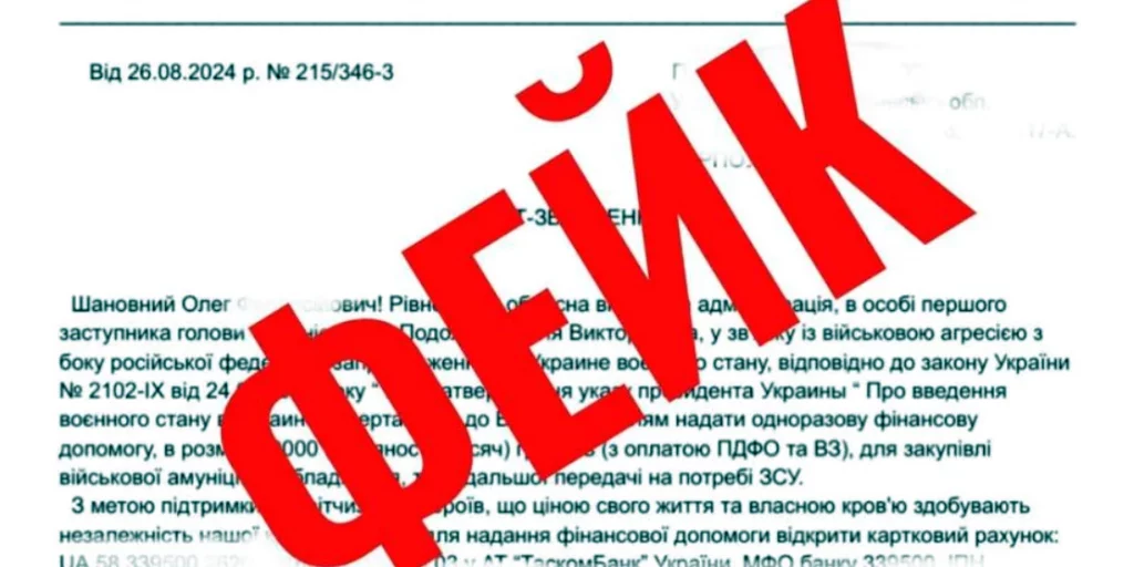 До керівників підприємств та організацій Рівненщини надходять листи від імені першого заступника голови Рівненської ОДА із проханням перерахувати кошти на банківський рахунок для підтримки армії.
