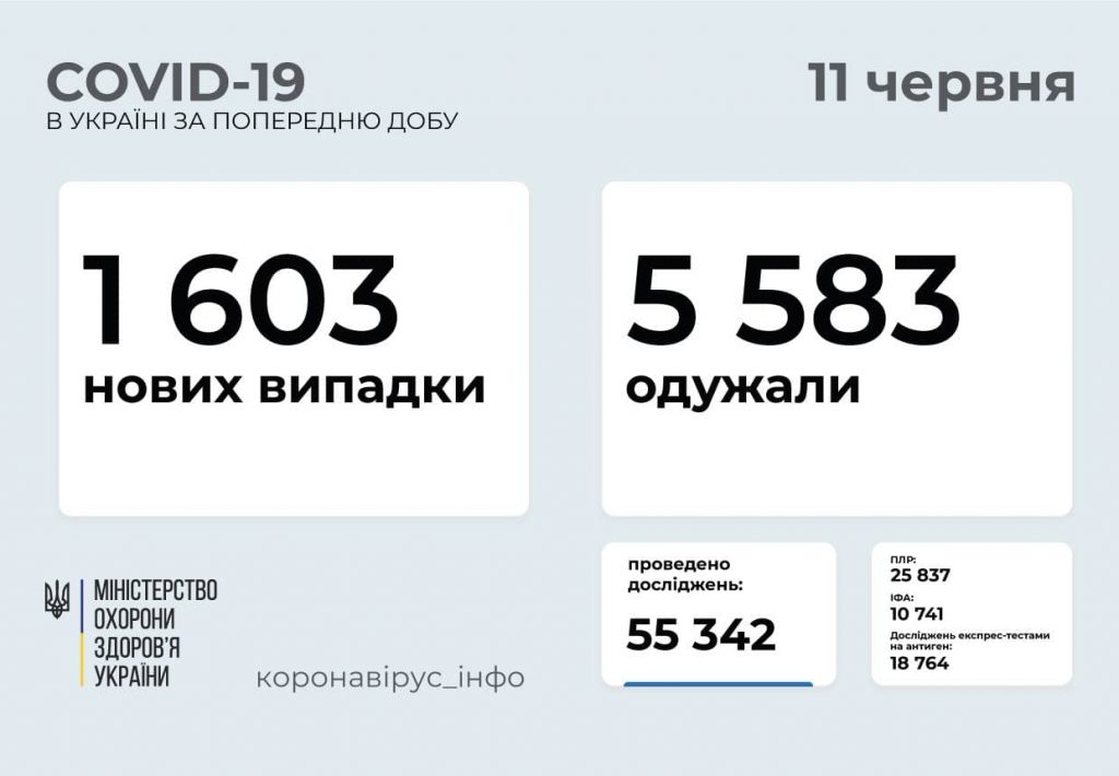 1 603 нових випадки коронавірусної хвороби COVID-19 зафіксовано в Україні станом на 11 червня 2021 року. Зокрема, захворіли 75 дітей та 72 медпрацівники.