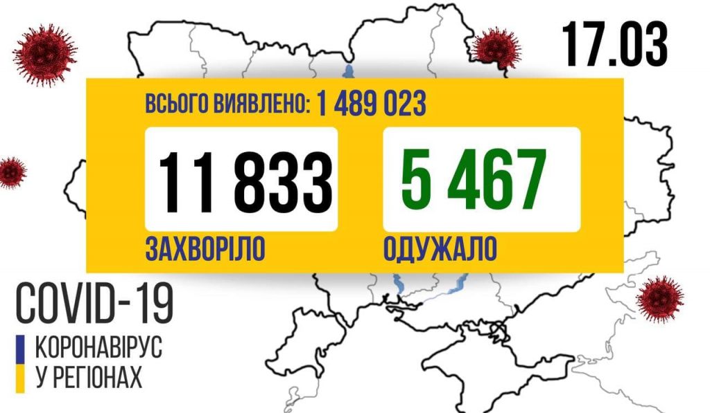 11 833 нових випадки коронавірусної хвороби COVID-19 зафіксовано в Україні станом на 17 березня 2021 року. Зокрема, захворіли 609 дітей та 388 медпрацівників.