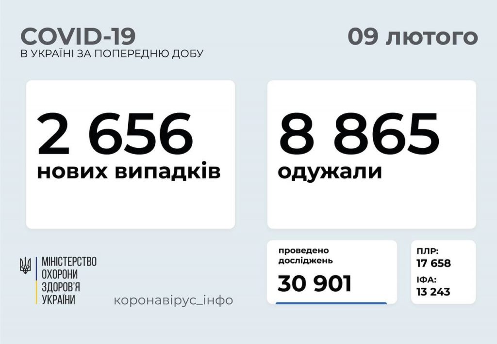 2 656 нових випадків коронавірусної хвороби COVID-19 зафіксовано в Україні станом на 9 лютого 2021 року. Зокрема, захворіли 157 дітей та 229 медпрацівників.