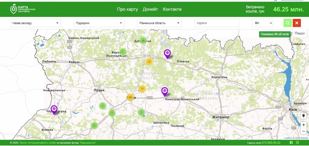 Українцям представили Карту коронавірусних закупівель. Її створила громадська організація “Антикорупційний штаб”.