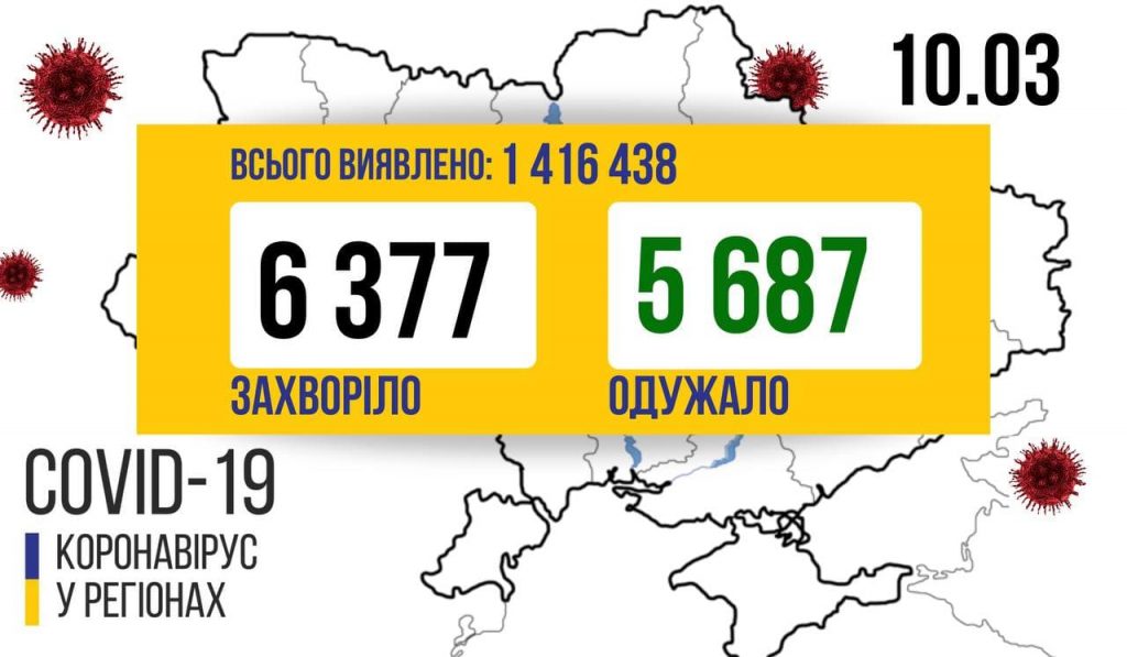 6 377 новий випадок коронавірусної хвороби COVID-19 зафіксовано в Україні станом на 10 березня 2021 року. Одужало 5687, а померло 219 людей.