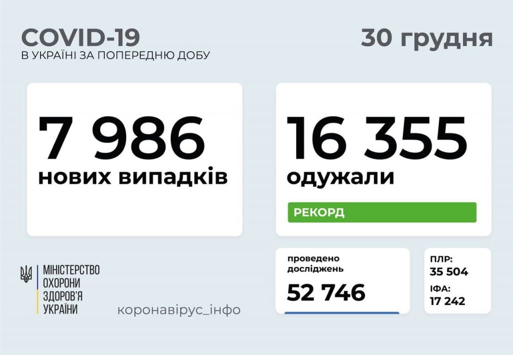 7 986 нових випадків коронавірусної хвороби COVID-19 зафіксовано в Україні станом на 30 грудня 2020 року. Зокрема, захворіли 272 дитини та 453 медпрацівники.