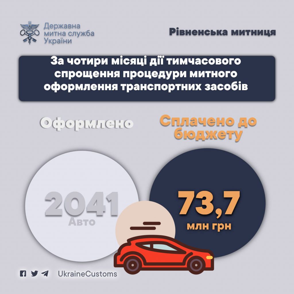 За чотири місяці дії законів України від 15 квітня 2021 року № 1403-IX та № 1402-IX щодо тимчасового спрощення процедури митного оформлення транспортних засобів, тобто з 15.06.2021 по 15.10.2021 включно, в зоні діяльності Рівненської митниці оформлено 2041 автомобіль. При митному оформлені даних авто громадянами до бюджету сплачено 73,7 млн.грн. платежів, у тому числі 17,3 млн.грн. добровільних внесків.
