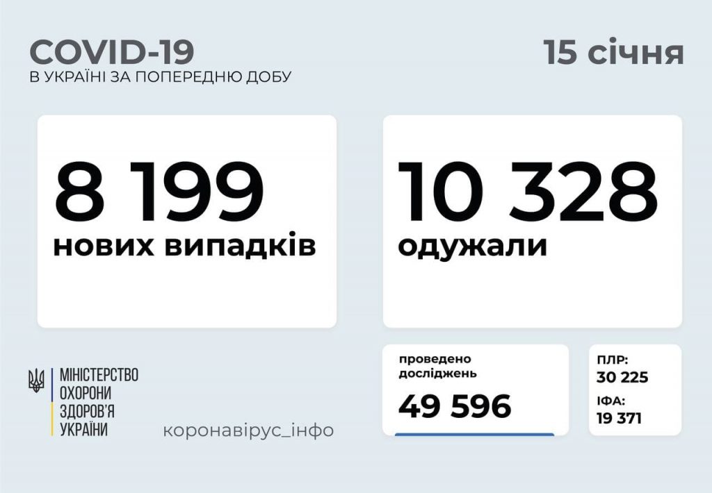 8 199 нових випадків коронавірусної хвороби COVID-19 зафіксовано в Україні станом на 15 січня 2021 року. Зокрема, захворіли 236 дітей та 315 медпрацівників.