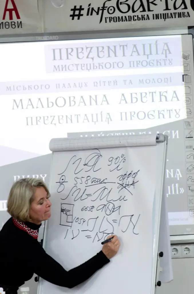 А потім – практика. Ми виписували кожну літеру Рутенії. Це непросто: московитські коромисла заважають. Але дітям було б значно легше. «Сіли на коня, намалювали чубчик…» Вісім ліній – і літера жива.