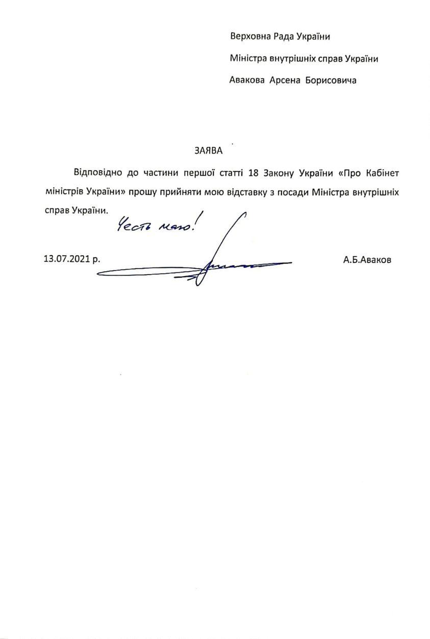 Відповідно до частини першої статті 18 Закону України «Про Кабінет Міністрів України» подав заяву про відставку з посади Міністра внутрішніх справ.