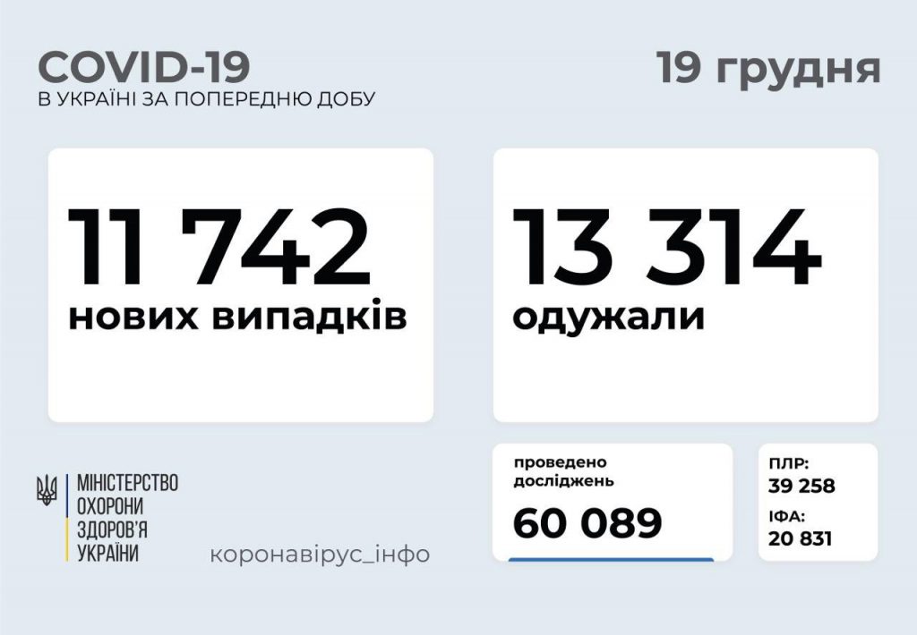 11 742 нових випадки коронавірусної хвороби COVID-19 зафіксовано в Україні станом на 19 грудня 2020 року. Зокрема, захворіли 547 дітей та 481 медпрацівник.