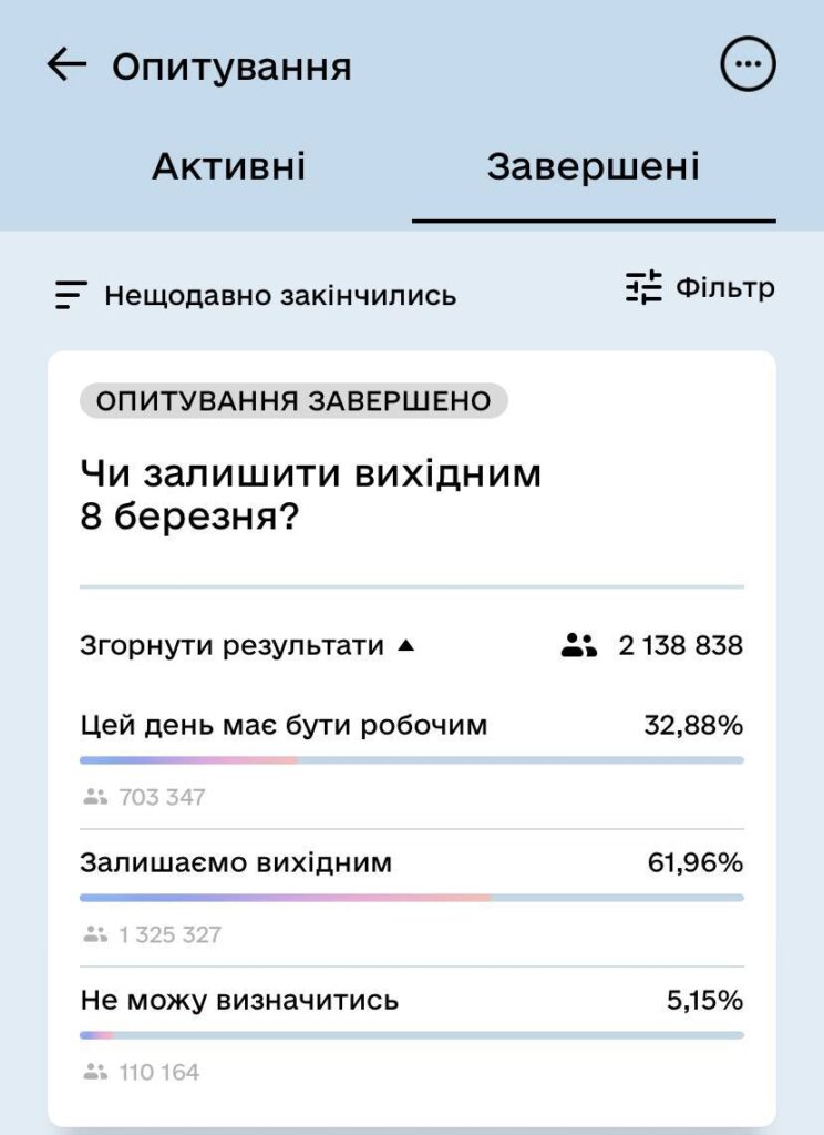 Такі результати опитування, проведеного в “Дії”.За вихідний на 8 березня виступає майже 62% українців. Проти – майже 33%. В опитуванні взяли участь понад 2,1 млн. українців – це рекорд. Вже стало традицією проводити опитування серед та узнавати думку населення стосовно спірних питань. Наприклад, новорічну ялинку у Рівному ставили після голосування громади