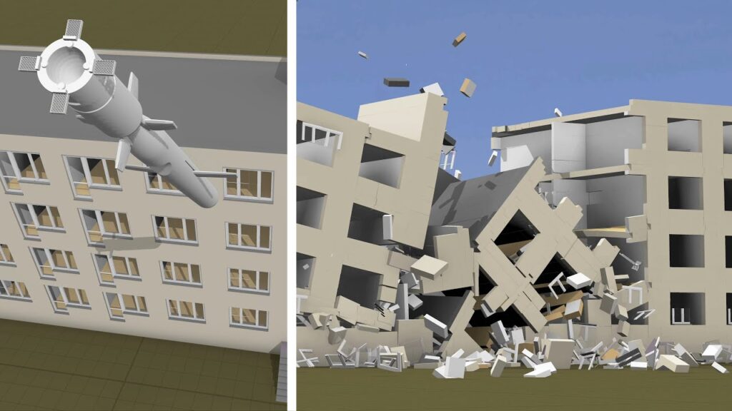 Подивіться на симуляцію російських ракет різного розміру, що влучають у житловий будинок. Ця робота базується на ранньому моделюванні вибухової хвилі.