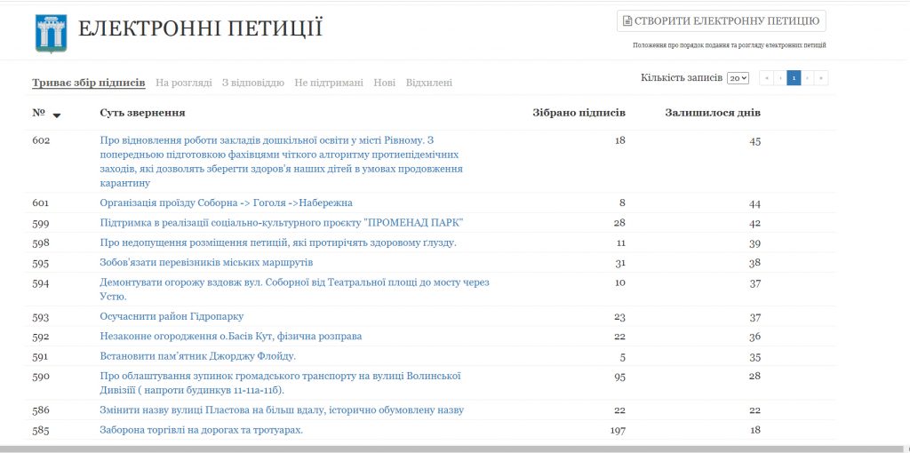 Нагадаємо, згідно з «Положенням про порядок подання та розгляду електронних петицій», електронна петиція – це колективне звернення громадян до Рівненської міської ради через офіційний веб-сайт Рівненської міської ради або веб-сайт громадського об’єднання, яке здійснює збір підписів на підтримку електронної петиції. Їх можуть подавати лише рівняни.