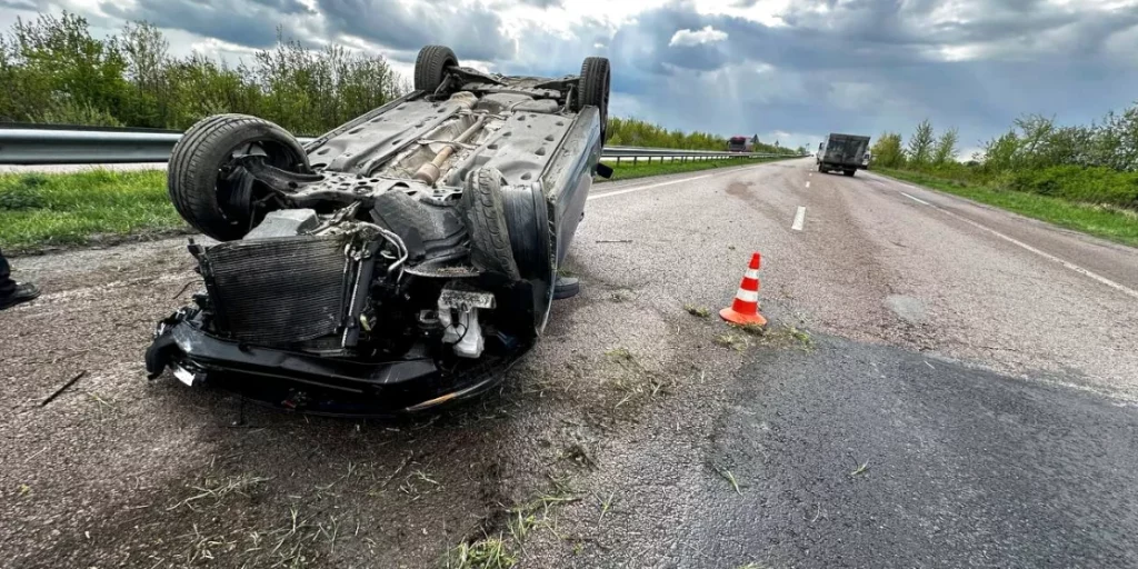 Попередньо відомо, що водій легкового автомобіля не впорався із керуванням та врізався у відбійник. Від удару авто перекинулось.