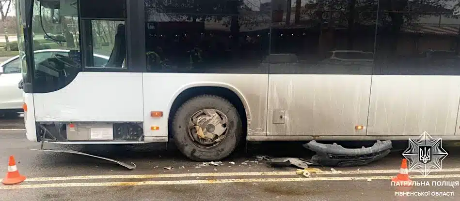 Як повідомили в Патрульній поліції Рівненської області, водій автомобіля Toyota збив кілька огороджувальних стовпчиків, після чого в’їхав в автобус і поїхав з місця ДТП.