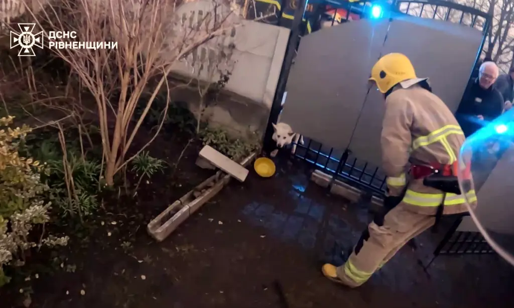 У Дубні вечірня пригода ледь не завершилася травмами для чотирилапого. Пес застряг у металевому паркані й не міг самостійно вибратися, а кожна спроба лише погіршувала ситуацію. На допомогу довелося викликати рятувальників.