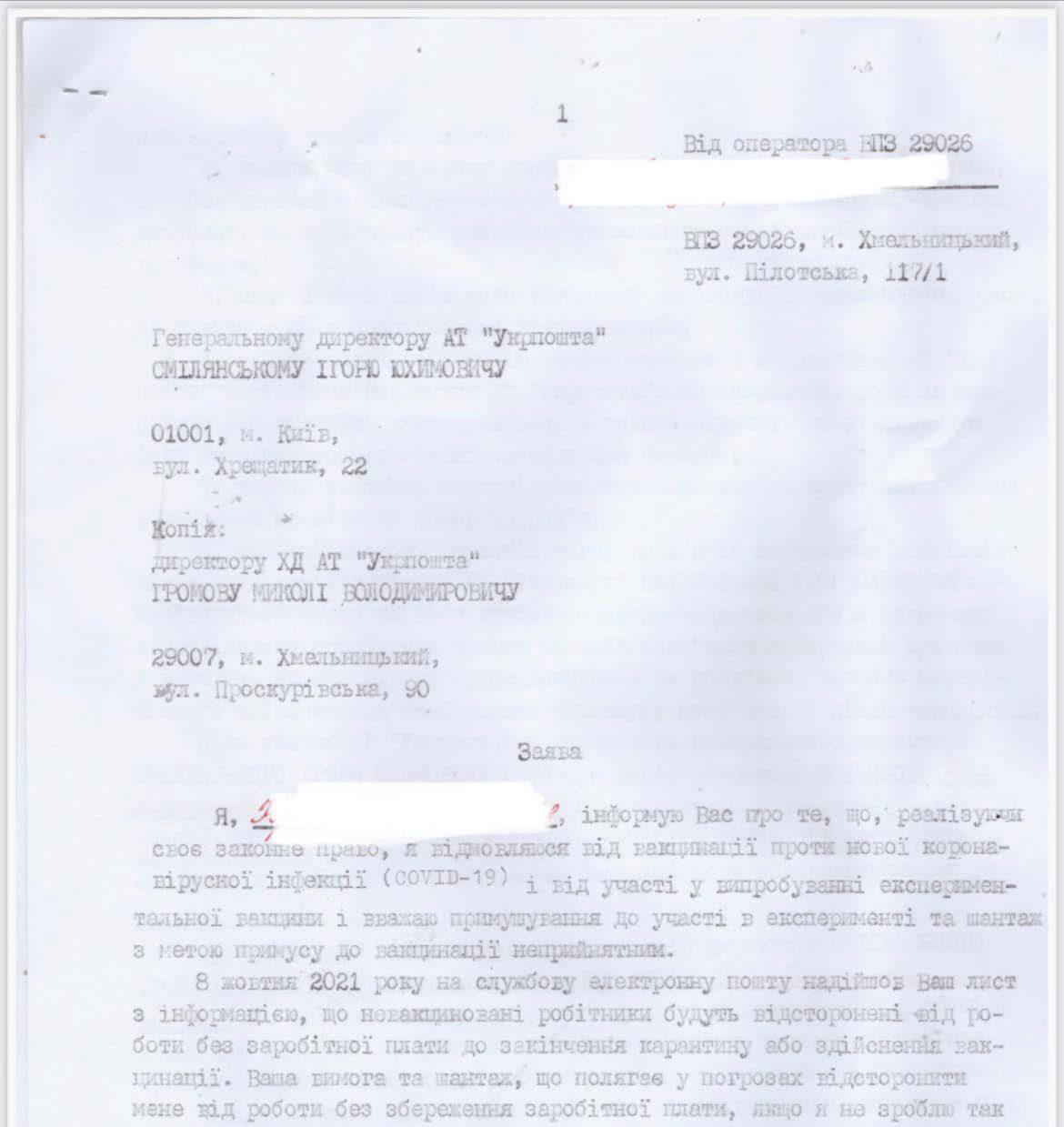 Працівник Укрпошти вимагає, щоб його не примушували вакцинуватися проти коронавірусу. У разі побічних ефектів або ускладнень на щеплення впродовж року після вакцинації, щоб виплатили йому €1 млрд компенсації.