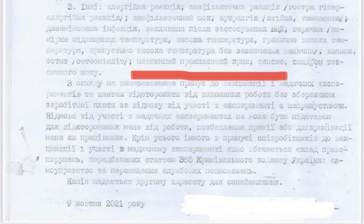 Примусова вакцинація є неприпустимою і заяви керівництва про відсторонення від роботи й позбавлення заробітної плати, премій без щеплення – протизаконні, ідеться в листі. Працівник вважає, що Смілянський у такий спосіб змушує працівників брати участь у “випробуваннях експериментальної вакцини”.