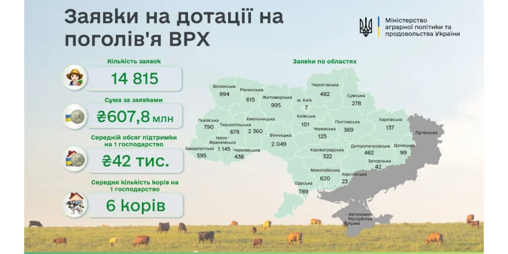 На бюджетну допомогу для утримання поголів’я корів у Державному аграрному реєстрі прийнято 14 815 заявок від аграріїв з різних областей України на загальну суму 607,8 млн грн.