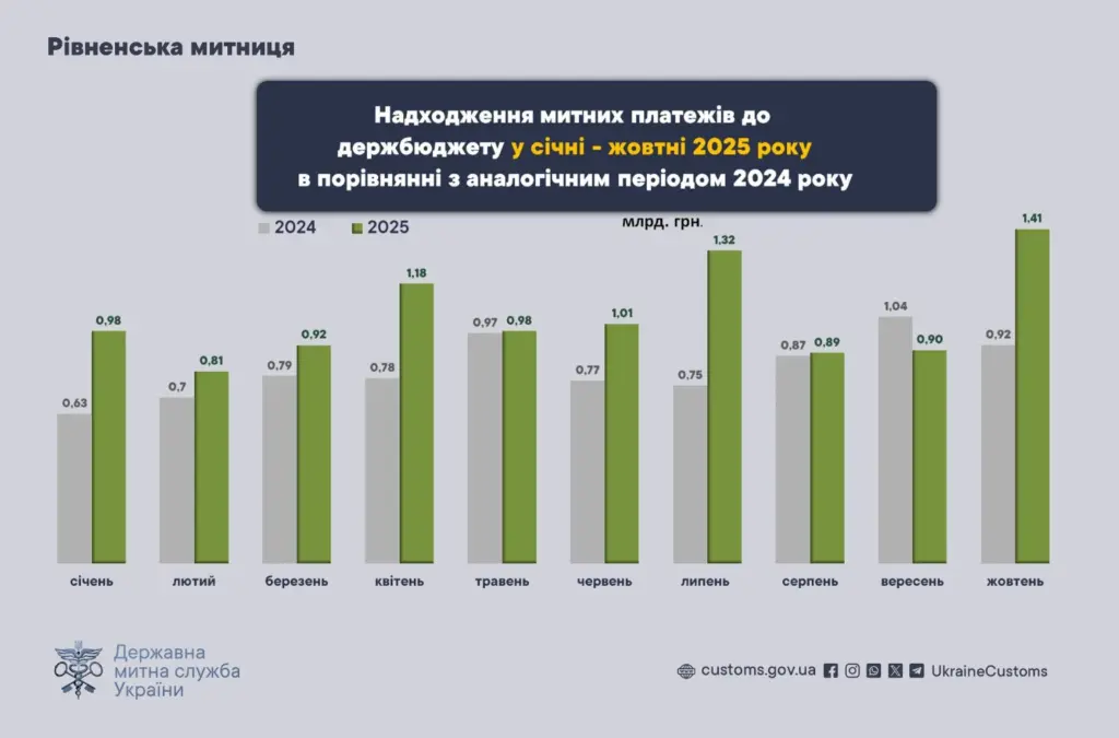У жовтні 2025 року завдяки відповідальності українського бізнесу Рівненська митниця перерахувала до держбюджету рекордну з початку року суму – 1,41 млрд грн митних платежів. В порівнянні з жовтнем минулого року сплачено на 500 млн грн, або на 53% більше податків.