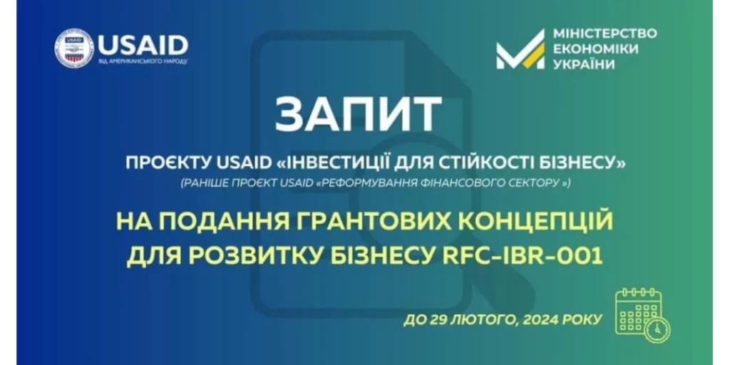 Проєкт USAID «Інвестиції для стійкості бізнесу» у партнерстві з Міністерством економіки України, оголошує Запит на отримання концепцій використання грантових коштів (Request for Concepts) від українських підприємств, які потребують підтримки для забезпечення зростання бізнесу, зокрема для збільшення продажів, нарощування експорту та створення нових робочих місць.