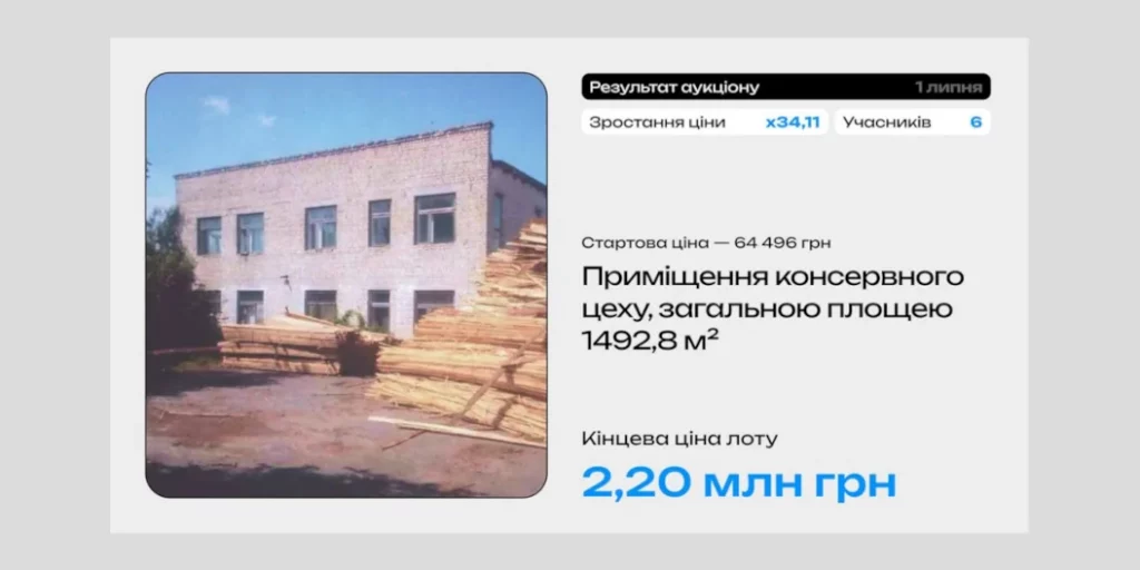 2,2 мільйона гривень. Такий результат онлайн-аукціону з приватизації приміщення консервного цеху на Рівненщині, що відбувся у системі «Прозорро.Продажі».