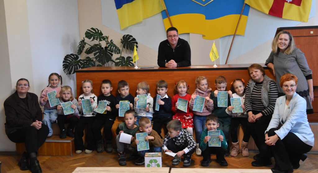 У залі засідань Гощанської селищної ради маленькі екоактивісти поспілкувалися із секретарем ради Дмитром Ткачуком та керуючою справами Анастасією Табековою. Діти дізналися, як працює місцеве самоврядування, чому важливо думати про довкілля й вирішили особисто долучитися до змін — передали зібрані батарейки на переробку.