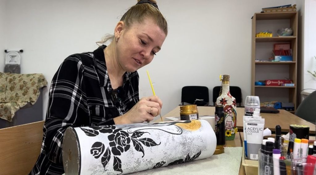 «Їх же спочатку треба добре помити, поґрунтувати. От уже Поліна це добре знає, щоби фарба будь-яка добре чіплялася до самого металу. Тубуси ґрунтуються й тоді, коли воно все підсихає, приношу, і дівчата працюють з підготовленими снарядами», – пояснила Олена Василюк.